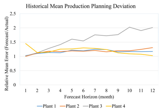 Figure 3 shows the Relative Mean Error Deviation (Production Forecast/Production Actual) for 4 plants. As expected, the further the forecasting horizon, the lower the quality of the forecasting values. Therefore, using the proposed method helps adjust the production planning data quality, and the forecast error propagation in the forecasting system is reduced therewith.