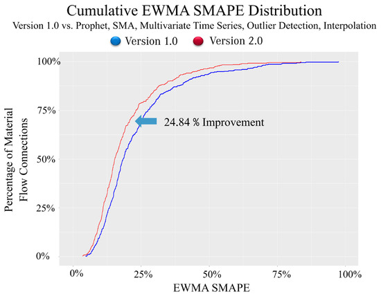 As pointed out in Section 2, the MSE was used to select the best-performing model. To analyze the business impact of the models, we used the SMAPE to compare model performance and improvement, since this enables a more straightforward interpretation of the error deviation. This section analyzes the performance of the forecasting system versions using the historically exponentially weighted moving average (EWMA) of the rolling 4-month-ahead out-of-sample SMAPEs. When comparing version A vs. version B, both systems’ versions were used to generate the forecasts for multiple months in the past using the same amount of data, then the EWMA is then calculated. With this, the EWMA-SMAPE Category distribution on the Material flow connections and the Cumulative EWMA-SMAPE Distribution is generated, as explained in the following sections.