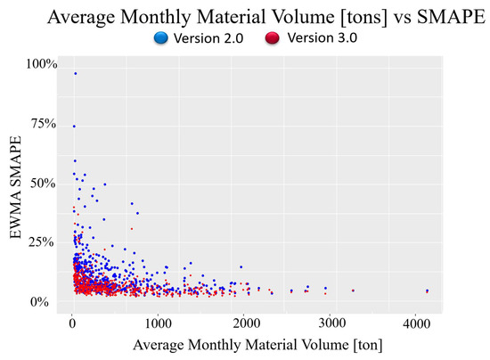 Finally, Figure 6 shows the performance of the forecasting system before and after applying this new approach, regarding the average monthly material volume and the SMAPE. It can be stated that the red dots representing the new forecasting system Version 3.0 realized a lower EWMA SMAPE over most material flow connections. Furthermore, material flow connections with more than 1000 tons on average also reached better performance, which can be directly translated into better performance planning in the inbound logistic network reducing logistic costs and capacity planning efforts.