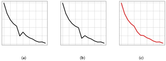 One of the promising methods for solving these problems is OCLTS (One Class Time Seires Shapelets) [1]. OCLTS applies important subsequences in time series data, called shapelets, to enable unsupervised anomaly detection and to provide the specific parts of the time series that are the reason for the anomaly detection. However, OCLTS has several difficulties. First, the anomaly score is based on complex correlations between local patterns, so there is no direct correspondence between the anomaly score and the location in the time series that is the reason for the anomaly. In addition, the shapelets learned by OCLTS tend to take the average shape of similar time series. For example, consider the pattern shown in Figure 1a,b, in which a single concave point appears in a rightward sloping waveform. The position of the concavity is different in Figure 1a,b, but when such a pattern is the learning target, shapelets tends to have an average waveform, as shown in Figure 1c, and the concavity feature becomes unclear. In this case, it is difficult to identify the basis of the anomaly from the anomalous waveform with no concavity.