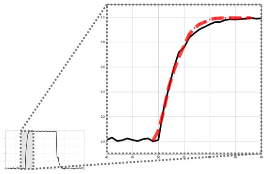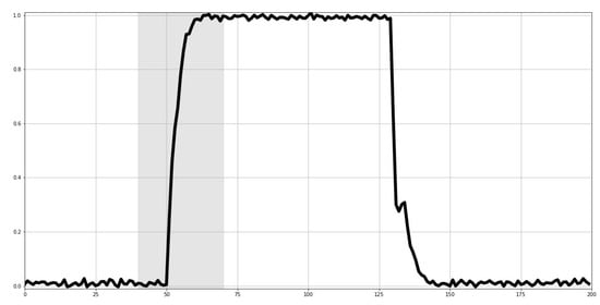 First, the results of the OCLTS visualization are shown in Figure 4. The black line is the original time series, and the upward phase showing the anomaly pattern is enlarged. The red line shows the shapelet obtained by training in OCLTS. The learned shapelet appears to be the average pattern of the training data. In the training data, the position of the temporary dip in the ascending phase varies, and as a result of learning the average pattern, the temporary dip disappears in the learned pattern. The visualization results of the proposed method are shown in Figure 5, where the normal pattern region is obtained as in Formula (11). The normal pattern region obtained using the proposed method shows a distorted region with repeated unevenness, and the original time series (black line) is found to be out of the normal region. This implies that the proposed method’s normal pattern contains some kind of uneven waveform in the ascending phase. Thus, the proposed method provides insight into the behavior of patterns based on subsequences, which is difficult to achieve with conventional shapelets.