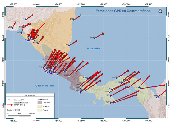 - LaFemina, P.; Dixon, T.H.; Govers, R.; Norabuena, E.; Turner, H.; Saballos, A.; Mattioli, G.; Protti, M.; Strauch, W. Fore-arc motion and Cocos Ridge collision in Central America. Geochem. Geophys. Geosyst. 2009, 10, Q05S14. [Google Scholar] [CrossRef]
