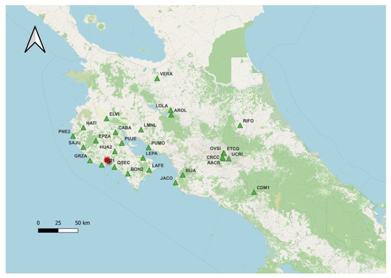 In this paper, the behavior of the time series of the stations near the earthquake that occurred in Nicoya on 5 September 2012 of magnitude 7.6 will be analyzed (see Figure 2).