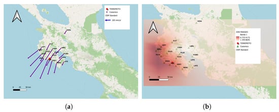All the time series close to the Nicoya earthquake on 5 September 2012 present a behavior similar to that shown in Figure 3, in which three phases are distinguished: preseismic, coseismic and postseismic. The travel speeds were calculated for each station shown in Figure 2, in each of the phases. In this way, the graphs of Figure 4, Figure 5 and Figure 6 are obtained. In Figure 4a, the vector displacement model can be seen in the preseismic phase, seeing that the stations near the coast present a similar behavior. Figure 4b shows the maximum geodesic deformation that occurred in the preseismic phase, observing a greater deformation in the area where the SAJU, PNE2 and GRZA stations are located. In Figure 5a we have the vector model for the case of the coseismic phase; it can be seen how the direction and magnitude of the horizontal displacement changes. Figure 5b shows how the geodesic deformation increased compared to the values obtained in Figure 4b. However, said deformation is caused in the same zone by also adding the zones of the HATI, IND1, QSEC and BON2 stations. In Figure 6a you can see the moment in which the Earth’s crust again has a linear trend; even so, it does not present a behavior as homogeneous as that visible in Figure 4a. Figure 6b shows the maximum geodesic deformation of the region; it can be seen how the PNE2, SAJU, GRZA, IND1 and QSEC stations continue to form part of the areas with the greatest deformation; in addition, this deformation can be seen in a downtown station such as CDM1.
