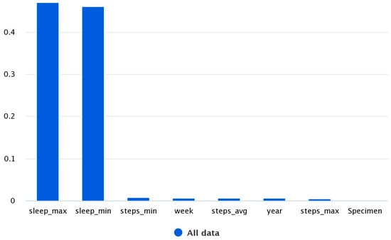 There are 624,001 rows in the steps–sleep data. There are a lot of missing data in the columns, that is why the explanation rate r2 with the regression target sleep_avd is only 0.024%. When all measurements containing missing data are removed from the data, 92,006 measurements remain. When this is regressed, the explanation rate r2 is 92.2%. When these values were aggregated with the arithmetic mean, the explanation rate r2 is 97.9%. From Figure 2, it can be seen that the minimum and maximum sleep were the main features estimating the average amount of sleep during the week.