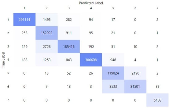 In the survey data, when classifying the object Cooper, the accuracy is only 26.3%. When the query intervals of the Cooper result are replaced by numbers 1–7, the accuracy decreases to 22.2%. When all survey data values are replaced with numerical equivalents, the accuracy was 25.5%. When the survey dataset is combined with the exercise dataset using the INNER JOIN operation with respect to users (user_id), at the same time, the values of the survey data are converted into numbers, the classification result increases to 95.8%. If we include the weight dataset to this using the INNER JOIN operation, the classification result again increases to 98.2%, as can be seen in Figure 3 and Figure 4.