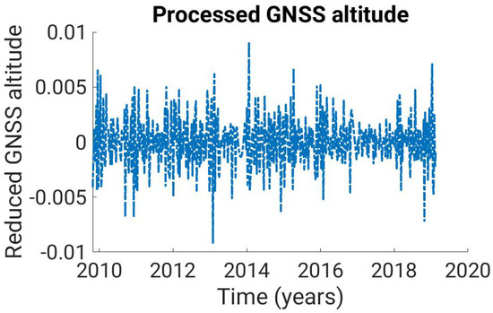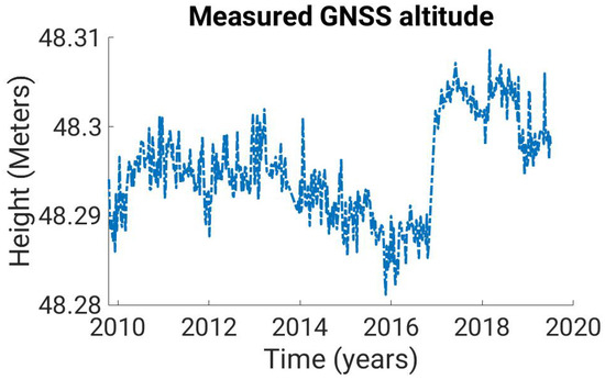 To test the theory, the time series of an altitude component of a GNSS station (shown in Figure 1) is used. The data were provided by the Federal Institute of Hydrology (BFG), which operates a GNSS monitoring network for georeferencing and monitoring selected measuring stations.