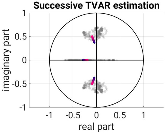 are in the unit circle (∀). Ref. [11] has shown how TVAR processes with linear root movements are successively estimated using TVAR(1) and TVAR(2) processes, and the advantages of this method compared to the estimation of time constant AR processes. The general TVAR estimate consists of two steps: First, the coefficients of the TVAR process are replaced by polynomials, where the order of the polynomial is equal to the order of the coefficient