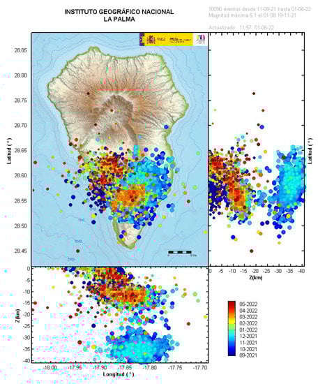 - Gónzalez, Cárdenas, M.E.; Gosálvez, Rey, R.U.; Becerra, Ramírez, R.; Escobar, Lahoz, E. La Erupción de Cumbre Vieja de 2021; University of Castilla-La Mancha: Isla de La Palma, España, 2022. [Google Scholar]