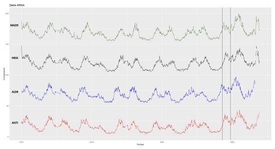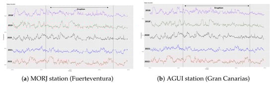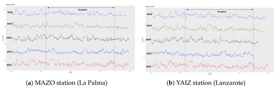 To give an idea of the behavior of the series, the corresponding results of applying the methodology, previously described, for the IZAN station in the time interval 2010–2020 are visualized, thus eliminating the possible influences that have occurred in the troposphere due to the volcano of La Palma, and, due to its location, the influence of the submarine volcano of El Hierro is also eliminated [