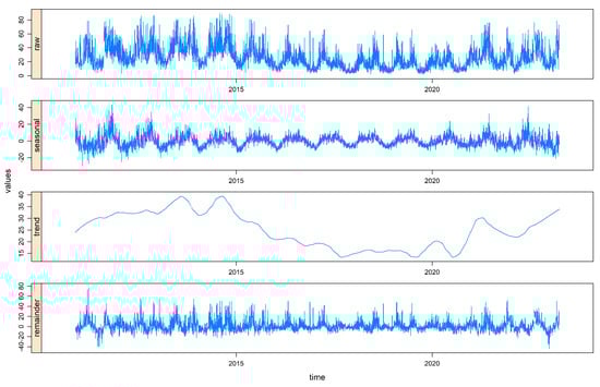 Figure 4 shows the behavior without the volcanic influence of the IZAN station during the period 2010–2020. In both images, it can be seen that the data present a periodicity, after half the year it is seen how the time series grows, thus producing a seasonality that provides maximum points in the graph, which can be seen in the seasonal component that returns the STL decomposition.