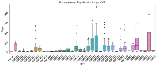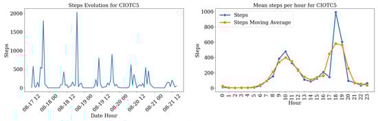 Based on data collected every hour over multiple days per each patient, the mean step profile is constructed. The mean steps profiles are generated after smoothing the time series. In order to smooth the time series, a centered rolling window with a size of three is computed. After this, data is grouped by the hour such that each patient has a mean representation of their activity throughout a 24 h period. The resulting data allows us to gain insights into a CCP’s physical activity levels and obtain a more accurate picture of their daily activity patterns as shown in