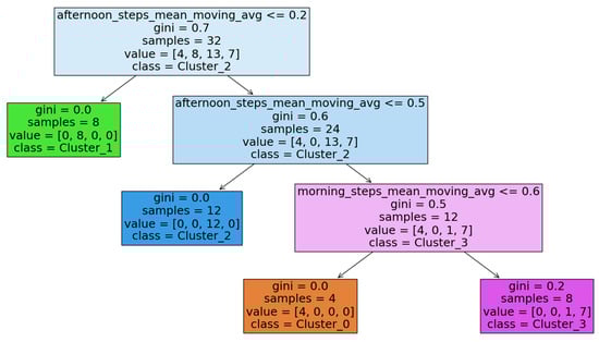 It was discovered that the primary disparity between the clusters was the average normalized steps taken during the afternoon. When fewer steps were taken during the afternoon, the patient was categorized into cluster 1. Following this division, patients were classified based on the number of steps taken during the afternoon. If the normalized steps taken during the afternoon exceeded 0.5, indicating considerable movement during that time, patients were classified into either cluster 3 or 0, depending on their activity levels during the morning. Conversely, patients who were not as active during the afternoon were classified as cluster 2.