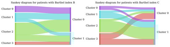 Table 2 indicates the presence of two predominant patterns of physical activity with respect to the CV. The primary distinguishing feature between cluster 0, predominantly composed of patients with a BI of type B, and cluster 1, with patients having a BI of type C, is the reduced variability in the duration of morning and afternoon walks. This finding suggests that patients in these clusters may exhibit more consistent patterns of locomotion, as opposed to a start–stop movement pattern.