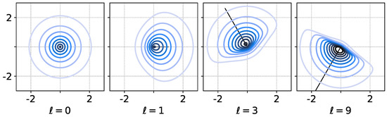 Visualization of level sets a single skew RBF as in Equation (2) in using and diagonal . Setting () restores symmetry. Various and ℓ (vectors shown in panels) directly correspond to a direction and magnitude of asymmetry in the RBF. Further shape control comes with choice of Euclidean W-norm (not shown).