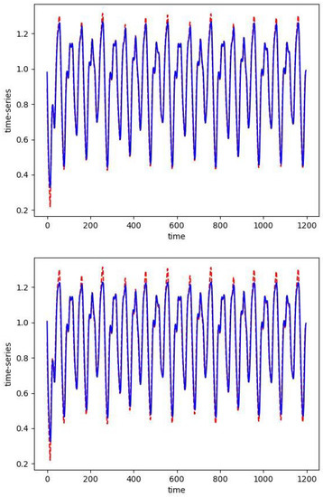 The one-step prediction (blue) of the Mackey–Glass time series (red). The first 800 points are training data. For both simulations we take Top: as expected, with , the solution of the optimization problem requires 50 skew basis functions. Bottom: with the sparse solution only uses 2 skew RBFs.