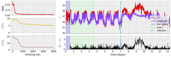 (Left): Decay of loss during training and diagram of associated time series. The mean-square error quickly saturates while one-norm of weight vector w slowly decays. Only a handful of non-zero model centers persist past the first 1000 iterations. (Right): Approximate mean-normalization is applied, followed by a delay (blue region) for TDE. The model is trained on three days of data (green region). The original time series (red, dashed) and model prediction of the learned model (solid purple) are shown. Pointwise prediction error of is shown beneath. Parameters: , , , .