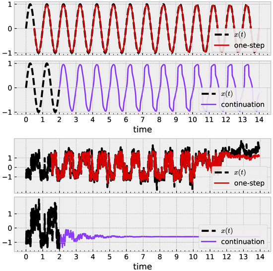 The broad question is to ask, “Did the model in fact learn the shape of my data?” The answer may be yes quantitatively if the time series continues to have small prediction error without further training or online learning applied. More holistically, we are interested in whether the time series learns a (quasi)periodic shape by approaching a limit cycle. Figure 5 illustrates this idea with a noiseless sine wave. One-step prediction (red) is successful; iterated prediction (purple) receives no further ground-truth, with some evidence towards the existence of a limit cycle. Similar application with a mouse time series in Figure 5 (bottom) succeeds in one-step prediction, but the iterated prediction exhibits behavior akin to an exponential decay to a fixed point.