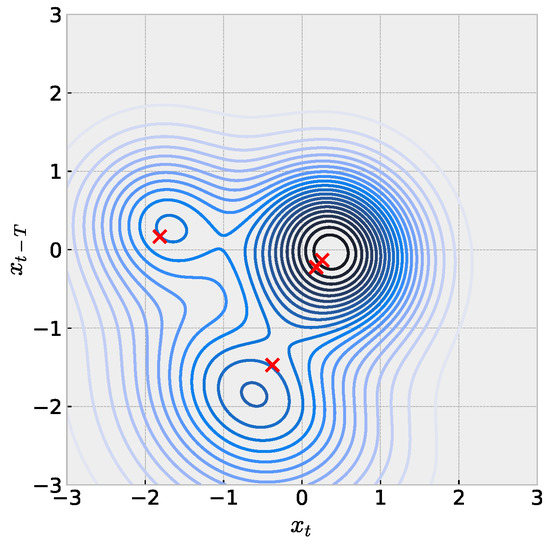 When the embedding dimension of a scalar time series is , we can reason about and explain the model with the full set of learned parameters in Equation (2). Figure 6 illustrates this idea with one such mouse time-series model. Following the expectation for penalization in the training objective, we consider weights to be numerically zero and then build the full function in analogy to the single sRBF illustrations in Figure 1. We emphasize careful interpretation with this figure. Red crosses represent locations of sRBF centers, which may not directly align with local extrema due to the asymmetry. Next, contour colors represents the value associated with the the prediction for , which cannot be directly visualized in the plane here. Ideally, we would like to understand how the learned model positions centers and shapes parameters to match the embedded time series in but requires subsequent visualization of time-series values. We leave this for future work.