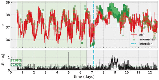 An important application area for time series modeling, especially with health data such as these, is anomaly detection. An anomaly can signal need for treatment, adjustment, intervention, etc. Additionally, it is important to carefully consider how to train such a model and how to evaluate success (or failure) depending on the specific application. Figure 7 illustrates these ideas with one such temperature time series. Here, the shaded green region marks training data, which is assumed “nominal” or “healthy” data (and in general requires knowledge of the application area). Square marks in darker shades of green on the time series denote detected anomalies. The definition of an anomaly can depend on the specific modeling approach; but often involves producing a scoring system (some function which maps input data to or ) which can be thresholded to produce a binary decision of “nominal” or “anomaly”. Ultimately, the threshold is a free parameter, and one mediates between false positives and negatives based on the choice. This figure illustrates two automated methods for choosing a threshold based on quantiles. The more sensitive of the two shown is a decision based on a new pointwise prediction error being greater than 99% of such errors in the training data. Increasing this threshold reduces sensitivity but hopefully also reduces false positives (the meaning of which is also dependent on the application). Anomaly detection remains challenging without applying a full time-series analysis pipeline which denoises or directly models noise, and we leave a more thorough investigation of the application of skew RBFs to this task to future work.