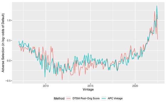 Figure 3. The comparison of APC vintage function to DTSM adverse selection shows that they are very similar. A small divergence occurs between 2012 and 2016, but recent measures are very well aligned. This suggests that the segmented APC analysis is a quick, computationally efficient way to capture most of the adverse selection problem, although there can be situations where an account-level score brings further refinement. Those advantages might be more acute when measured for a single lender where the volume by loan attributes can swing more rapidly.