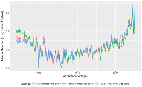 Figure 1 computes the change in adverse selection by vintage comparing origination to post-origination logistic regression scores. The figure shows that including APR information in the score does refine our understanding of adverse selection in 2016–2017, where the origination score residuals are overestimated and 2018–2019 where the origination score residuals were underestimated. The scale of
