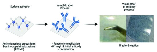 The ZnO active layer was employed as a matrix for immobilization of the biological recognition element (antibody). The advantage when using the ZnO as an immobilization platform on TFTs is that it is an oxide; hence, there is a higher generation of OH- groups. Therefore, the use of bifunctional molecules like silanes allow to have a higher amount of available binding sites for antibodies. The Figure 2 shows a representation of the immobilization process on ZnO TFTs.