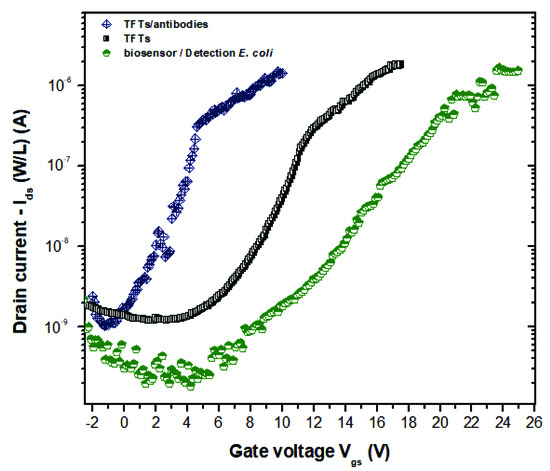 When antibodies are immobilized an important change in the transfer characteristics is observed and it is attributed directly to the presence of antibodies in the biosensor. It is suggested that when antibodies are on the active layer, they are able to change the behavior in the conduction channel resulting in that observed displacement. Since the antibodies have an intrinsic charge derived from their aminoacid residues, this has an influence on the needed voltage to reach the on–off regions [10]. Afterwards, when bacterial detection takes place, the displacement towards positive voltages affects the previous contribution shown by the antibodies, which is mainly related to the bacterial membrane adhered in the antibody variable region. It is suggested lipopolysaccharides and other components of the bacterial membrane exert a resistive effect on the conduction channel. Based on these observations, the perceived changes on the transfer characteristics of detection are directly relate d to the used bacterial concentration (1 × 108 CFU/mL). Therefore, it is suggested that lower bacterial concentrations will allow to observe different displacements between both curves (Figure 3 blue and green).