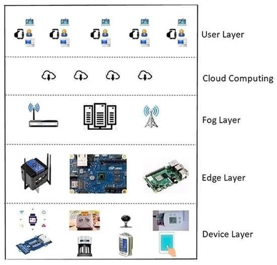 Today, WSNs play a key role in the Internet of Things (IoT) [3]. This fact is because the first layer of the IoT structure requires a physical parameter, making WSNs good candidates. To better visualize this phenomenon, an entire structure of an IoT mechanism is presented in Figure 1. In this figure, the first layer includes devices that sense physical information to be reported to the edge layer. The edge layer performs an initial process and extracts meaningful information to be transferred to the upper layer for further analysis and storage purposes. Due to the increasing amount of data that needs to be processed, the edge layer is unable to handle its duties. Therefore, the systems with time-sensitivity face significant problems in terms of making critical decisions on time. This issue resulted in the development of a new layer—a fog layer—with more powerful hardware components. Cloud computing, on the other hand, represents a structure that usually resides in a single point on the Internet, which does not require any installation; thus, it can work from anywhere at an affordable cost. The final service is provided to the users through cloud computing.