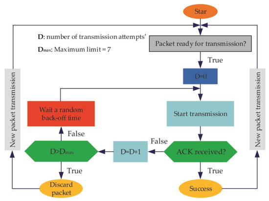 ALOHA has a straightforward transmission policy that allows each object to start transmission immediately upon generating a packet. After a transmission, the transmitting object expects to receive a positive response from the receiving object, which represents the successful confirmation of reception. This response packet has a very small length, which is typically set to 1 byte, and is called the acknowledgement (ACK) packet. In cases of packet loss due to collisions, the responsible object will receive no ACK packet and treat the transmitted packet as collided and lost. Next, a retransmission process is started to retransmit the collided packet in sequence. A limit to the maximum number of retransmissions is set to 7, and the lost packet beyond this limit will be discarded. A random time, which is referred to as back-off time, is selected to allocate a duration among the successive retransmissions. This back-off time aims to reduce the probability of collisions by resending the collided packets at different time intervals. The whole process is presented in Figure 4. The objects are accepted to be in range of receiver unit, meaning that each object has a direct link to the receiver. The packet generation process is equally assigned to each node, which have the same average inter-arrival time. The packet length is also set to a constant length at the beginning. Another assumption is to allow the objects to transmit at the same power level. With its advantages, ALOHA has inspired the advancement of a lot of MAC schemes, having the key focus of improving the pure performance.