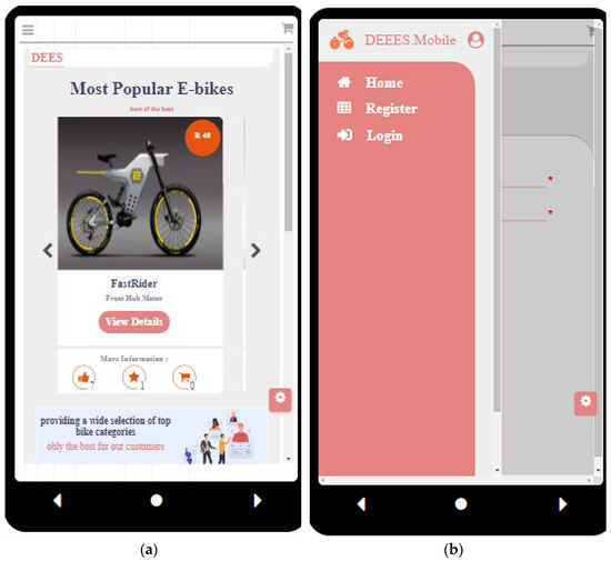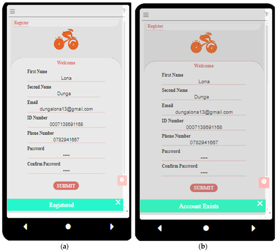 The application displays the front page containing information about the different electric bikes for use with the respective information. The user can scroll on the sides to view the different e-bikes. Figure 11a displays the client-side page with the different electric bike options for rental. The application displays the home page linked with the index page that contains the layout information about the electric bikes that can be used. The user can scroll on the sides to view the different e-bikes. A front-end page is provided where the visitor can insert their details to be stored in the database. The application registers a visitor successfully and stores their details on the firestore database (Figure 11b). Figure 11b represents the mobile application dashboard that the visitor can see. This page contains the home page to view the different electric bikes and the registration page with the registration form to become a new customer. The purpose of the login page is to allow the user to gain access to the application by entering their e-mail address and password, as shown in Figure 12a. The application is expected to allow the registered customer to log in. The database is expected to store the account details of the user. In a scenario where an already registered user refills the register form, a message that says that the account exists will pop-up (as shown in Figure 12) because the database holds the details (Figure 13).