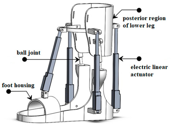 As shown in Figure 6, the description is a prototype of an ankle exoskeleton with four electric linear actuators, consisting of the following components: