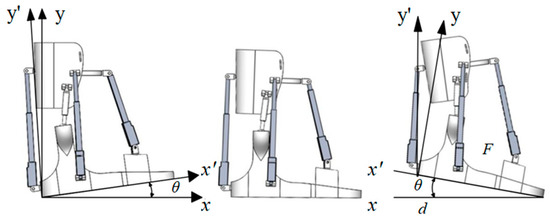 Consider Figure 4, where determines the angle of movement of dorsiflexion and plantar flexion, is an absolute coordinate system, is a movable coordinate system, determines the beam of force, because the force comes from some part of the weight of the ankle (the weight of the entire foot is not provided, since the patient relies only on, for example, if we take the patient’s sitting position), then it also describes the stiffness of the tibial–ankle joint, is a constant distance, and is the torque transmitted by the motor to adjust the angular orientation.