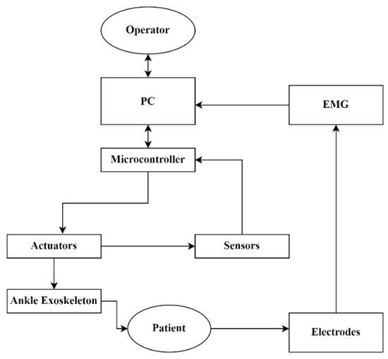 As shown in Figure 5, the ankle joint rehabilitation system that we have implemented consists mainly of a PC (personal computer), a microcontroller, an activated exoskeleton, and a device for recording myoelectric signals (EMG). The PC has three functions: it interacts with the operator (who may be a therapist or even the patient himself) using a graphical interface, registers and processes the patient’s myoelectric signals, and, finally, communicates with the microcontroller via a serial connection to transmit commands or receive sensory information. The microcontroller generates the necessary control signals for the drives and monitors their actual position using sensors on them. The actuators affect the exoskeleton of the patient.