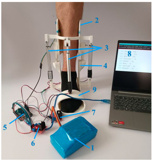 Experiment test bed: 1—battery, 2—shank platform, 3—actuators, 4—ball joint, 5—microcontroller, 6, 7—drivers, 8—PC, 9—foot platform.