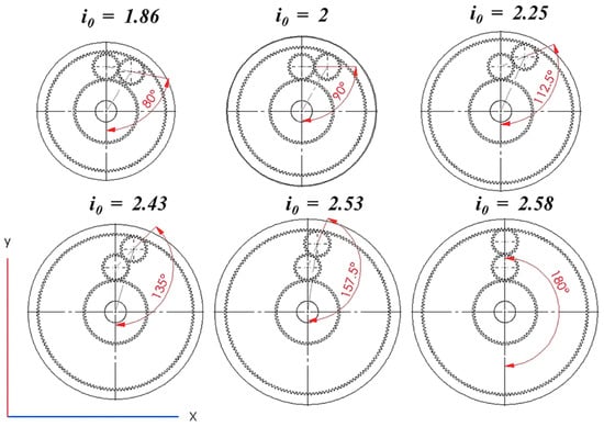 All studies will be based on the same model, redesigning the gear train used in [8]. Since all the components and measuring equipment are readily available. It comprises a module 2 sun gear 60 teeth with profile shift x = −0.417. Two planet gears with 24 teeth each. And different ring gears depending on the set-up. Six test scenarios are considered in the study with different angles between the planet axles, as shown in Figure 4.