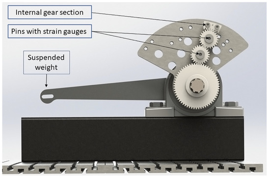 As mentioned before, the physical experiments are done with a redesigned version of the test rig used in [8]. A special component with the locations of all pins is used in place of the carrier. Sections of ring gears are 3D printed and used for different scenarios. The experiments are static. A lever with calibrated weight is used to apply 50 Nm of torque to the sun gear. The ring gear is fixed to achieve the same conditions shown in Figure 5. The model of the test rig can be seen in Figure 7.