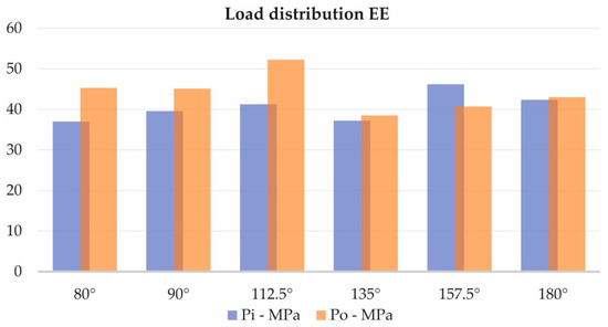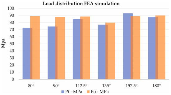 Pi describes the MPa value on the inner planet, while Po the value of the outer planet. A slight difference in stress between the various positions is observed. The outermost planet is more loaded with smaller angle values, and the inner is more loaded with higher angle values. The Values shown are an average of 5 simulations for each scenario. A chart representation of the results is depicted in Figure 9.