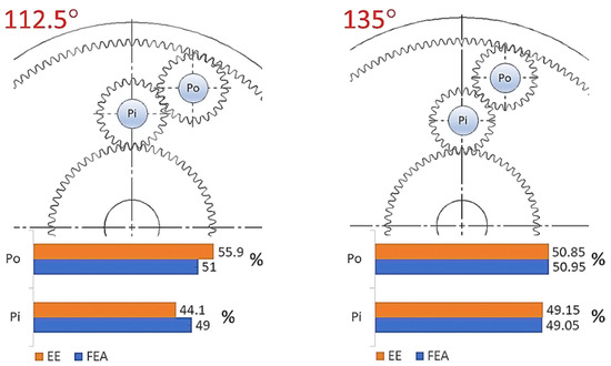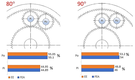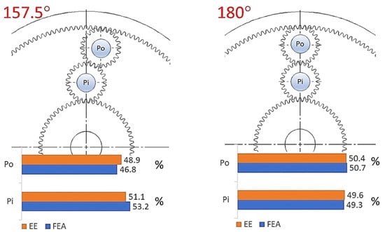 The following Figure 11, Figure 12 and Figure 13 compare the results for each scenario from both CAD and empirical experiments. Because of the differences in stress and force values, the data is shown as a percentage ratio between loads of the planet pins—Pi for the inner planet and Po for the outer planet.