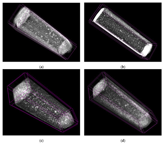 In this research, a 1024 × 1024-pixel X-ray camera was used. The applied X-ray source excitation range was 20–65 kV, the applied power was 50 W, and the spot size was 50 µm, as selected according to the specimens’ characteristics, while a flat-panel sensor supplied 1944 × 1536 pixels. The volume of the reconstructed images exceeded 1536 × 1536 × 1566 pixels, corresponding to 1000 slices. The maximum tube voltage and X-ray frequency were 100–240 V AC and 50–60 Hz, respectively. The X-ray absorption of each voxel was controlled to 14-bit gray values.