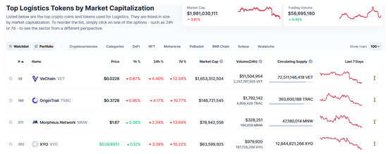- CoinMarketCap. Top Logistics Tokens by Market Capitalization. Available online: https://coinmarketcap.com/view/logistics/ (accessed on 21 April 2023).