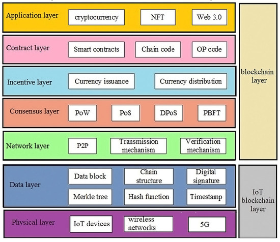 The proposed abstract model (Figure 4) integrates a smart contract with blockchain and IoT to perform secure transactions in any business and register heterogeneous data. In [19,20], an abstract model is presented, according to which blockchain technology works on six layers—the data layer, network layer, consensus layer, incentive layer, contract layer, and application layer. Technologies related to IoT work on the lower two layers of the OSI model (data link and physical layer). In the abstract model proposed by the authors, the integration of the two technologies is considered in seven layers—the upper five layers represent the operation of the blockchain technology, and the lower two layers form the IoT blockchain layer, which provides the communication channels between the IoT sensors, the physical wireless network and the blockchain network. At this layer, the data are collected and transmitted for recording on the blockchain network. In this way, the proposed abstract model represents the process of integrating the two technologies regardless of the chosen blockchain implementation (the type of consensus mechanism, the way the smart contract is written, whether it is a private or public blockchain, whether it is tied to cryptocurrency or not, etc.). On the other hand, it makes blockchain management independent of the selected sensors, the implemented physical network, the selected wireless communication technology, etc. Furthermore, sensors can be of different types—GPS sensors, RFID sensors and IoT sensors for BLE, ZigBee, 6loPan, etc.