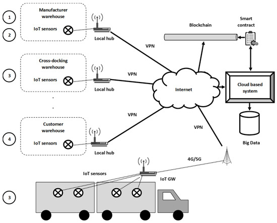 A traditional logistics process of parcel/cargo delivery, managed centrally with a cloud platform and based on IoT, is presented in Figure 2.