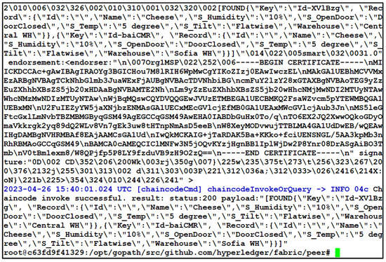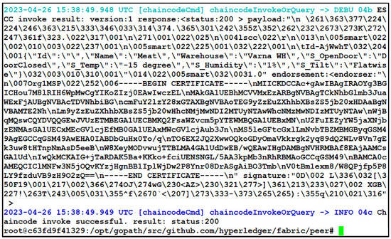 To test the functionality of the smart contracts, a special docker cli container is used, in which commands are executed to send requests to the smart contracts. Figure 8 shows a successful execution of a request to write an object-goods when it is loaded into the means of a truck (recording in channel 2). In the request, information is sent about the state of the product (meat) loaded from the Varna warehouse, and the current values of certain parameters. The object attributes that are stored (name, warehouse, temperature, humidity, door opening, tilt) are shown. A successful execution is indicated with a result code of 200.