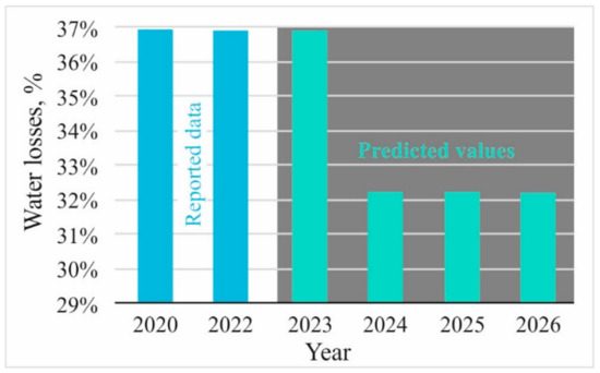 In the territory of Bulgaria, water supply and sewage services are provided by 45 Water Supply and Sanitation (WSS) operators. One of them is WSS Ltd.—Ruse (Ruse, Bulgaria). According to the company’s approved business plan, the amount of actual water losses should decrease by 1% per year in the following years (Figure 1).