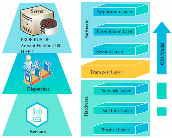 In the AWSMS built in this way, the actual control and management are carried out by the on-duty dispatchers (manual management and control). They receive data on the PC monitor from the TS by objects and based on the technological assignments manage the processes. To implement an automatic system with intelligent functions, it is necessary to build it according to the requirements of the OSI model (Figure 2). This means digitalization, i.e., replacing dispatchers with a digital device (AI).
