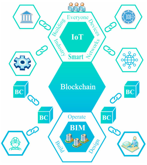 To improve the functionality of the water supply system through IoT and blockchain technologies, it is necessary to carry out additional research to build a smart city [7]. For this purpose, the difficulties and possibilities of implementing the cited technologies must be analyzed so that they are compatible with the currently existing measuring devices and that the digitized information is managed according to the BIM (building information modeling) life cycle—IoT and BIM are interconnected technologies [8] (Figure 3).