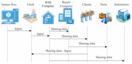 The communication scheme in Figure 4 presents the data-sharing flows in the event of an emergency. The accident can be registered by a sensor or by a client. They transmit data about the location of the accident to an employee. This employee enters the event into the company’s system and all nodes that are responsible verify this event—in this case, it is an employee and a sensor or customer that stops signaling the event. An emergency signal is sent by the company to a repair company or a team. It responds that it has received event data and sends a transaction to its suppliers or other teams. They also return a reply that they have received the transaction and within a certain time place the corresponding part order. One may be available in stock but may also be specific. In addition to the repair node, the WSS company sends transactions to all customers in the area where there is an accident and the deadline for its elimination. At the same time, depending on the type of accident (e.g., leak), a signal is sent to the responsible state institution (Ministry of Environment and Water) for testing the cleanliness of the soil in the presence of a construction site to the local electricity supply company for the presence of increased danger to construction companies.