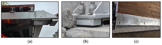 Elastomeric bearings for bridges are usually delivered with a top plate that is welded to the superstructure on-site. This allows for final positioning with regard to the built foundations. Aluminium’s welding challenges and bearings’ locations under the trusses’ chords led to a different positioning strategy, requiring no welding on-site. The bearing’s top plate shown in Figure 2a is already welded to the superstructure. The anchoring rods shown in Figure 2b are grouted in oversized holes that were drilled based on the precise surveys of the backfilled foundations and the fabricated superstructure.
