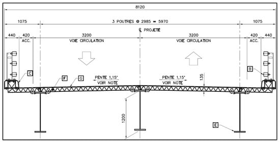 This structural arrangement was developed in the context of adding a multiuse path on various long-length vehicular bridges. Such bridges’ decks would rely on the presence of floor beams spaced between 5 and 15 m apart, which would define the aluminium structure’s span. The pedestrian bridge is continuous in bending and shear across the length of each of the vehicular bridge spans as described further. The material’s lightness allows us to reduce the cost of reinforcements of the vehicular bridge. Moreover, the targeted spans are easily accommodated by adjusting the depth of the aluminium girders, which is an important advantage when compared to an orthotropic steel deck system.